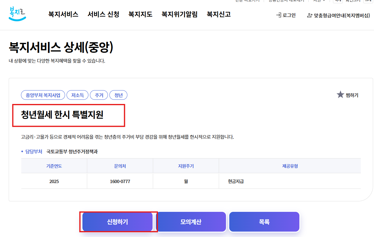 - [서비스 신청] -> [복지서비스 신청] -> [기타] -> [청년월세 한시 특별지원] 선택