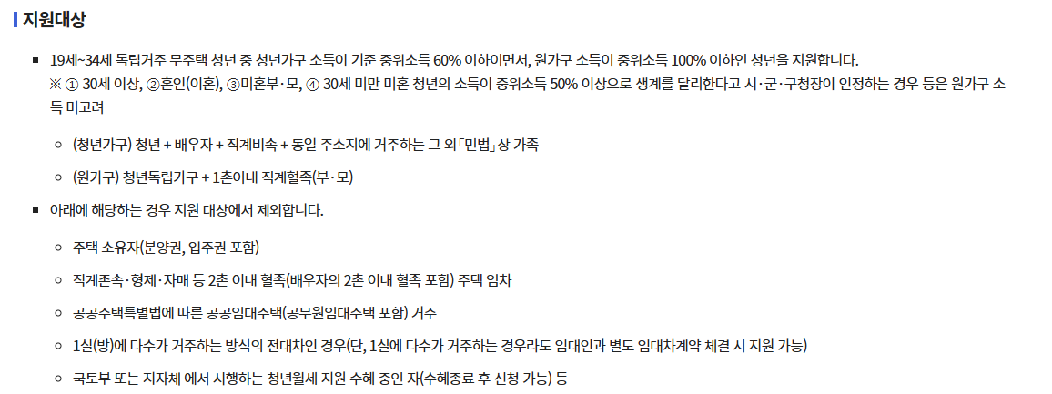 - 지원 금액: 실제 납부하는 월세 범위 내에서 월 최대 20만 원 지급