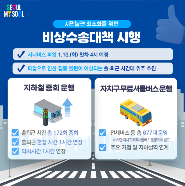 - 대중교통 이용 전: '서울 대중교통' 앱이나 서울시 홈페이지를 통해 실시간 버스 운행 여부를 반드시 확인하세요.